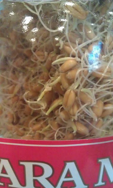 As typical, I cannot remember where I first read about this. I swear I cannot remember anything these days. (Menopause is such a wonderful stage in every woman's life...Not!) Anyway, if I remember where it was later, I will update this post. But basically you soak the seeds in a glass jar overnight, then you rinse them out twice a day. I think I can handle that. So when my wheat seeds arrived I already had my big jar ready. Some folks use quart-sized mason jars, but I like this big jar, so for my experimentation phase I am using it instead.
